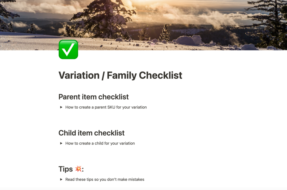 Notion template that provides a checklist for setting up variations